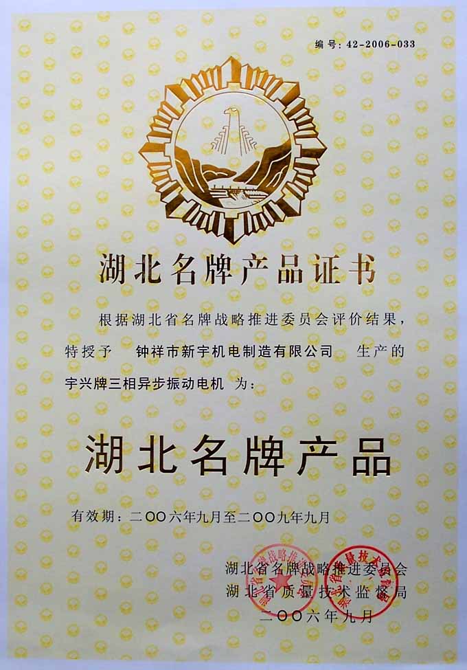 湖北名牌产品证书